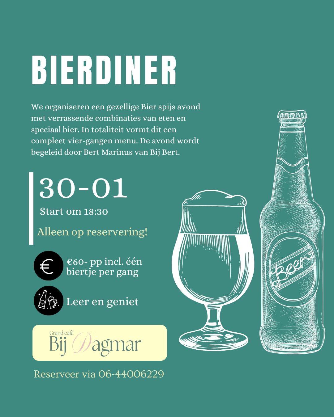 Op vrijdag 30 januari organiseren we bij Grand Café Bij Dagmar een gezellige bier-spijsavond met een viergangenmenu en speciaal geselecteerde bieren bij elke gang. De avond wordt begeleid door Bert Marinus van Bij Bert. We starten om 18:30 uur. De prijs is €60 per persoon, inclusief één biertje per gang. Alleen op reservering.