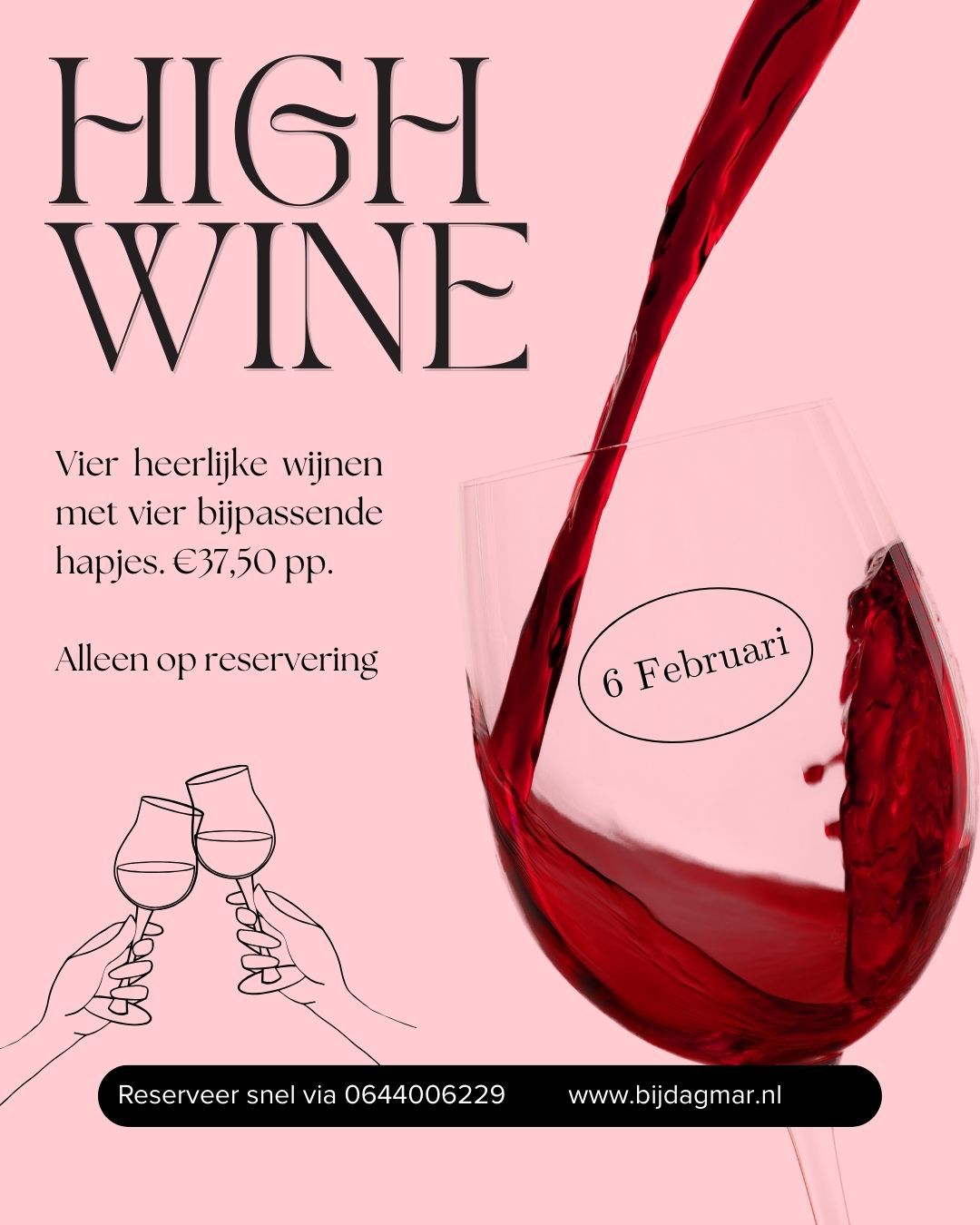 Op vrijdag 6 februari organiseren we bij Grand Café Bij Dagmar een gezellige High Wine. Je geniet van vier heerlijke wijnen, elk gecombineerd met een bijpassend hapje voor een verrassende smaakbeleving. De High Wine kost €37,50 per persoon en is alleen mogelijk op reservering. Een heerlijke middag om samen te genieten van mooie wijnen en fijne gerechtjes.