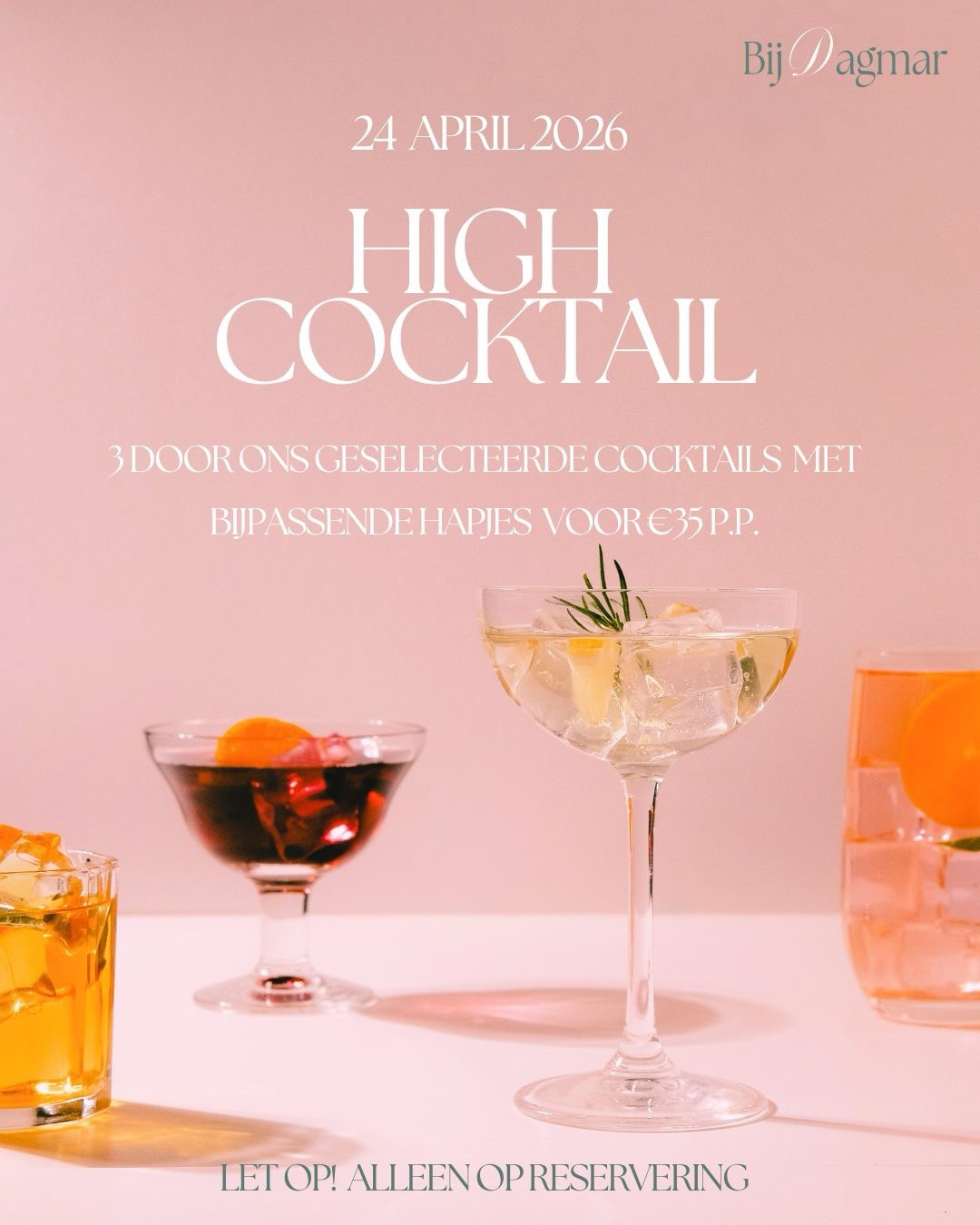 Op 24 april organiseren wij een High Cocktail lente editie. De dagen worden langer, de zon laat zich weer zien…. en dat betekent maar 1 ding: tijd voor een frisse high cocktail avond. Geniet in de avond om 21:00 uur van drie heerlijke cocktail met bijpassende hapjes.