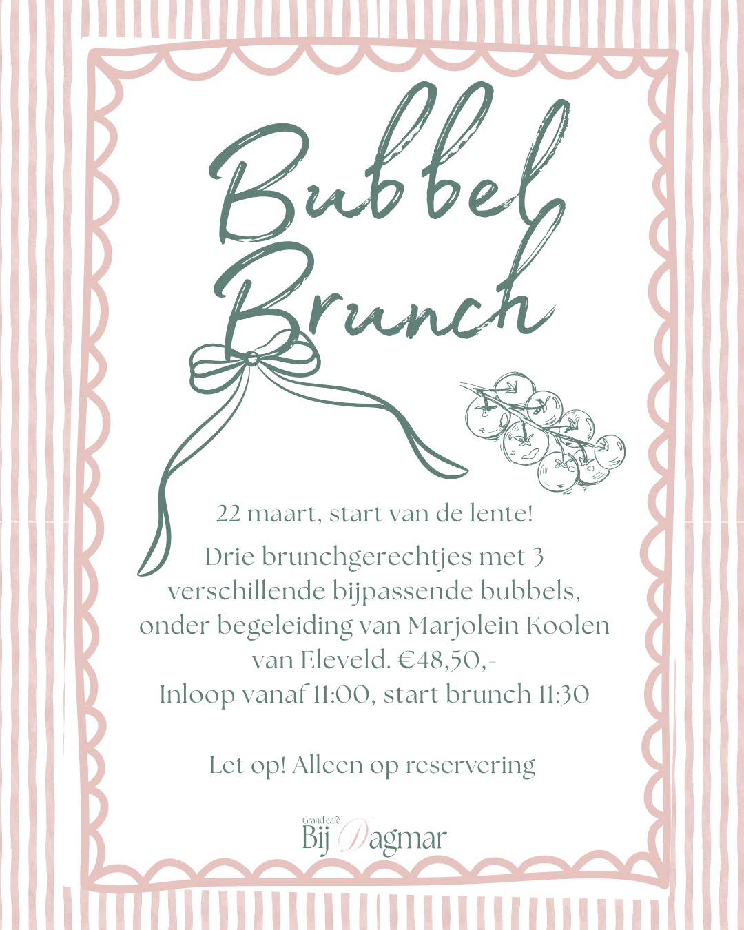Op 22 maart organiseren wij bij Grandcafe Bij Dagmar een bubbel brunch onder begeleiding van Marjolein Koolen van Eleveld Wijnen. Geniet van 3 verschillende brunch gerechtjes en 3 verschillende bij passende bubbels.